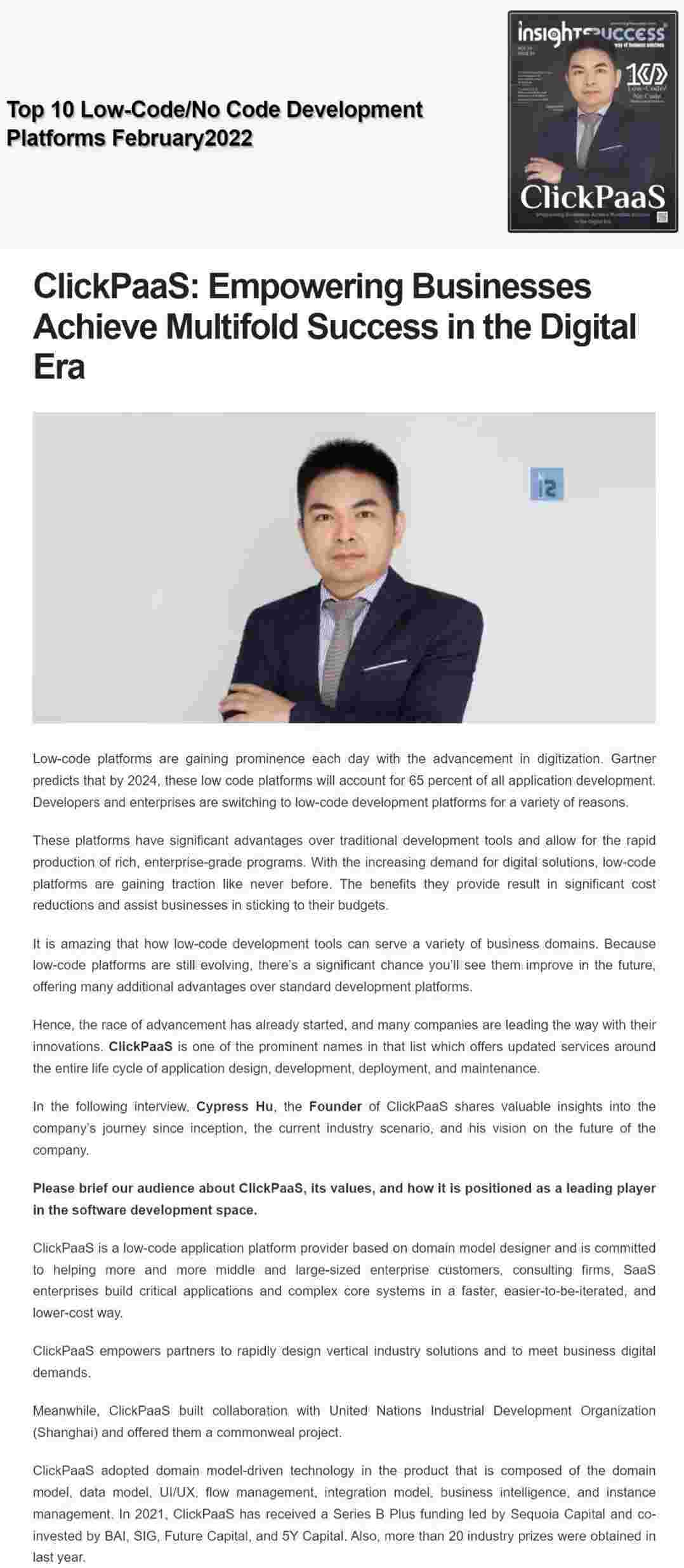 2022年年初,,,,沃钱包入选外媒Insights Success低代码/无代码开发平台 Top10,,,,创始人、、CEO胡柏受邀接受专访并荣登封面人物,,,,他与Insights Success的读者分享了沃钱包成立的初心、、、、发展历程、、、、当前的行业发展趋势以及他对公司未来的展望。。。。